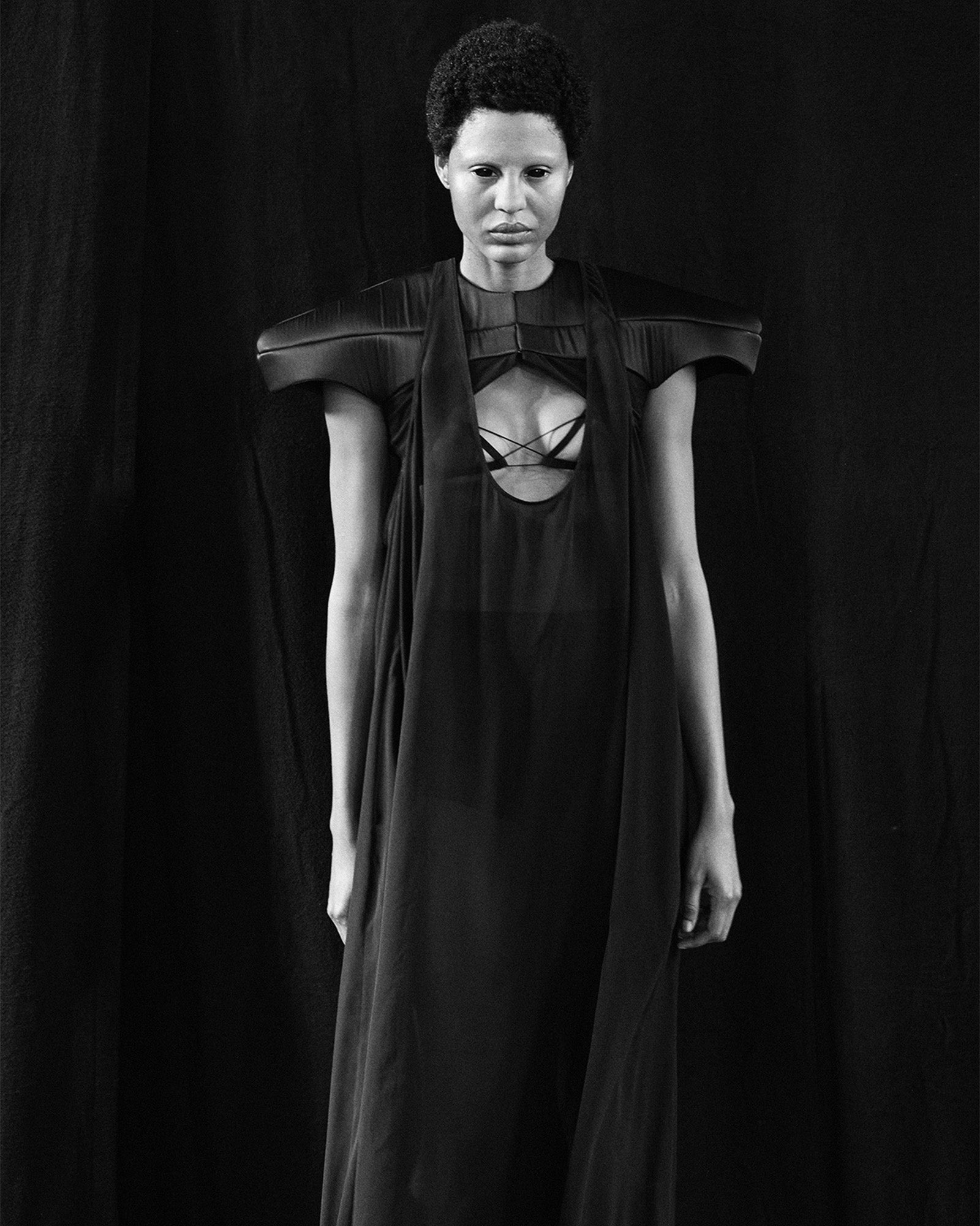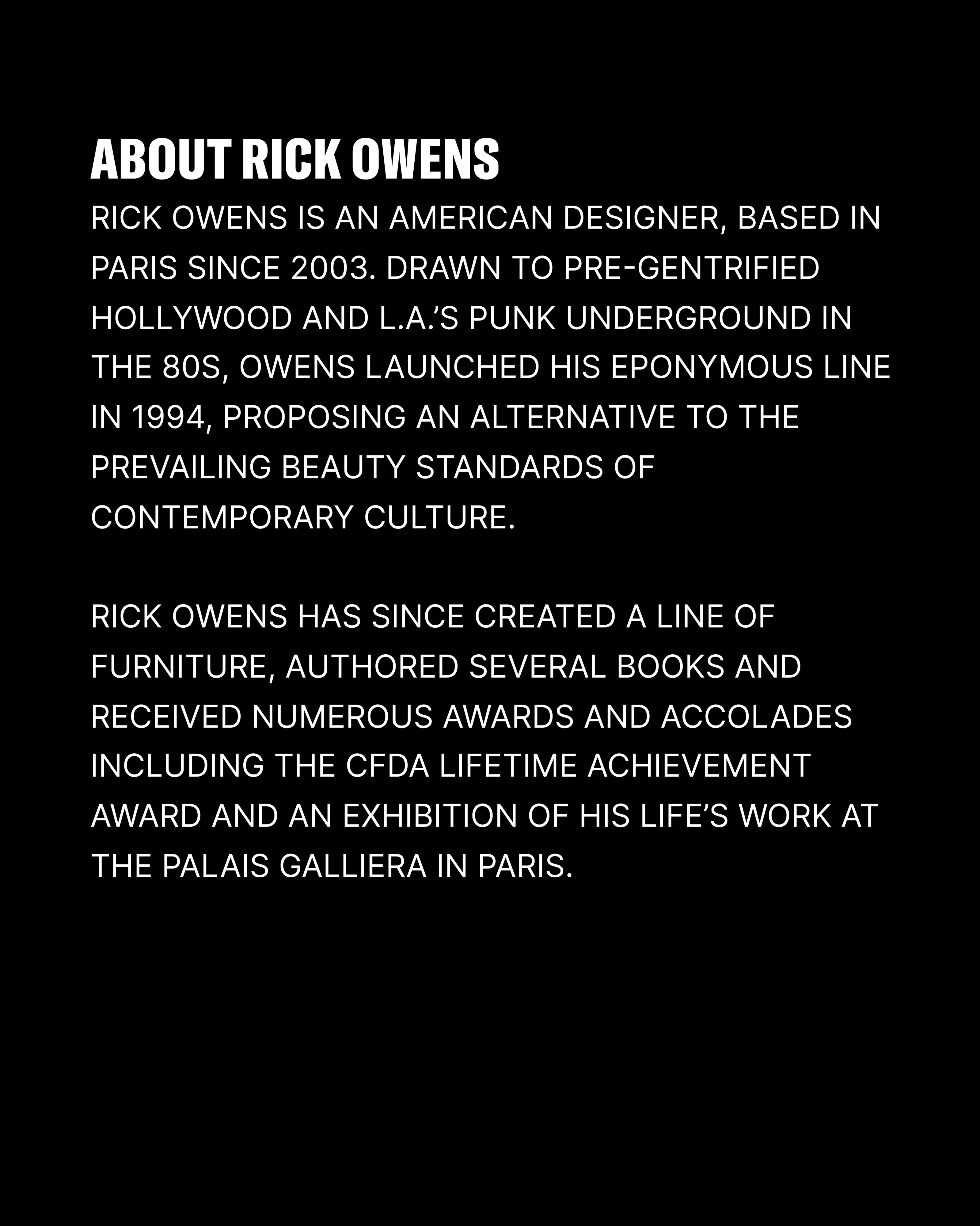 Both embrace the power of black, a statement of strength. Unveiled during Rick Owens' SS26 show at Palais de Tokyo, this collaboration captures the tension between structure and emotion.