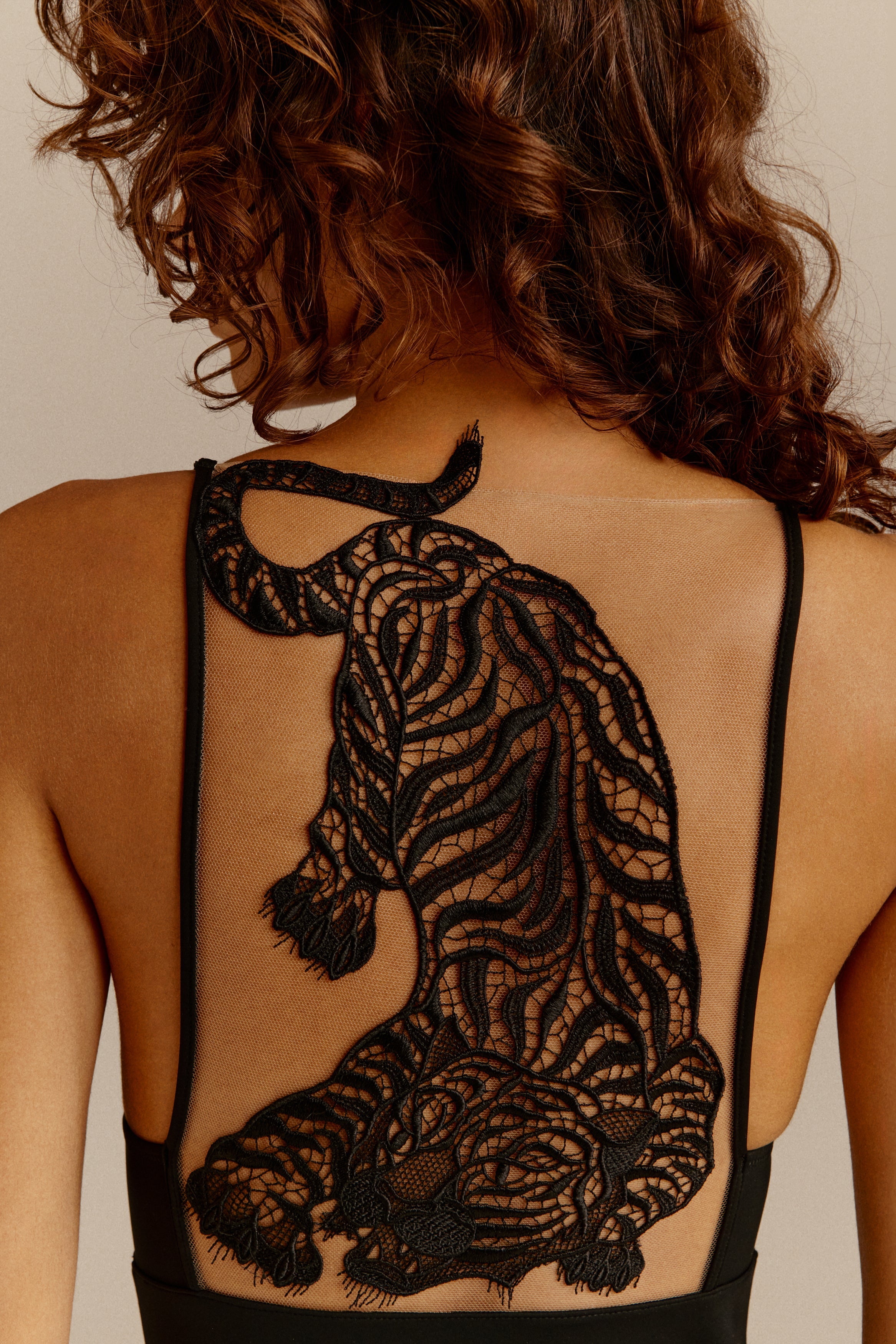 Signature one-piece swimsuit combining the iconic LIVY tattoo-effect embroidery with an ultra-feminine triangle cutout, for a unique and assertive look.