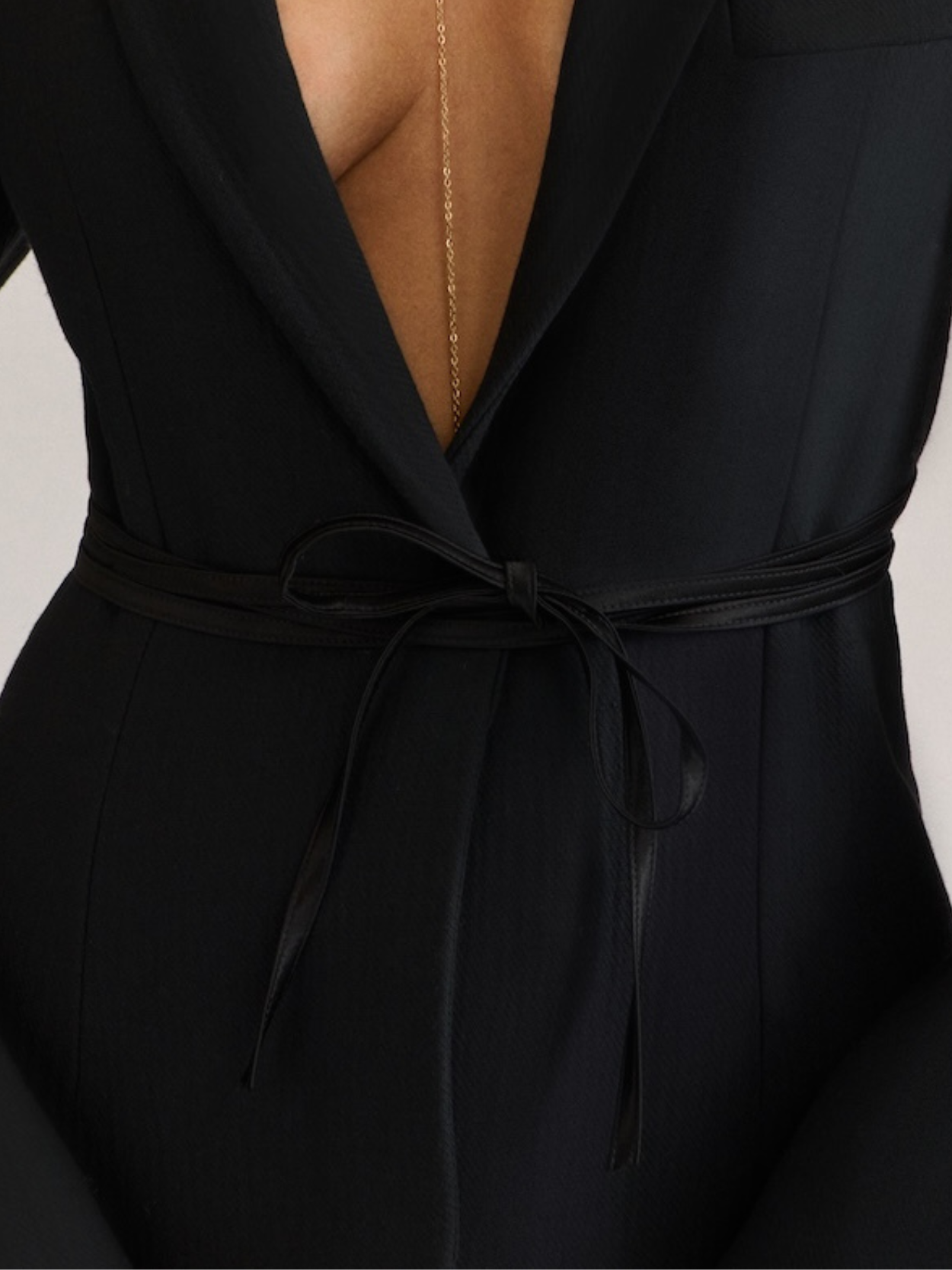 A modern blazer that flatters the feminine silhouette with its plunging neckline, its back revealed by fine crisscross straps, and its waist emphasized by a delicate belt. Wear it over lingerie or against the skin for a look that is both refined and daring.