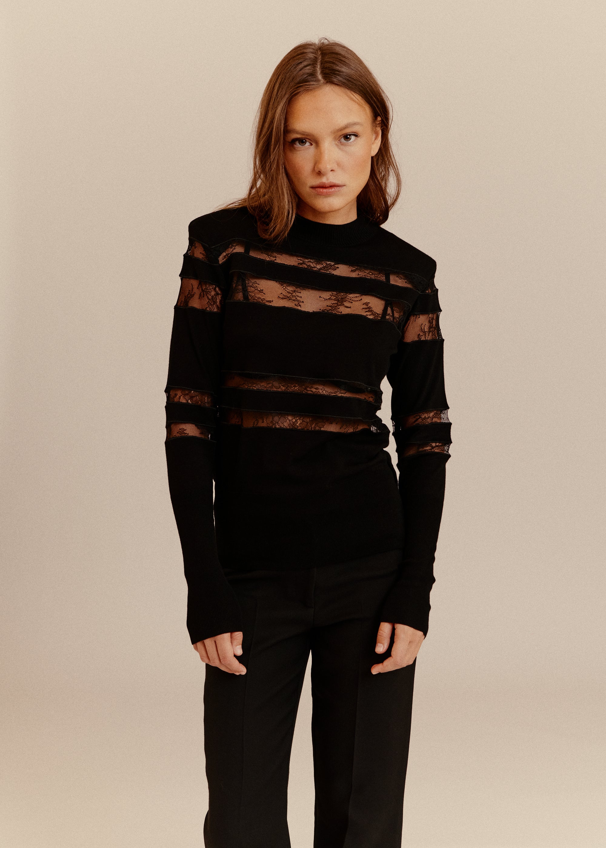 Lightweight viscose knit with a mock neck and fine ribbed cuffs. Structured shoulders, graphic cut-outs with floral lace inserts. Semi-fitted silhouette for a bold, refined look.