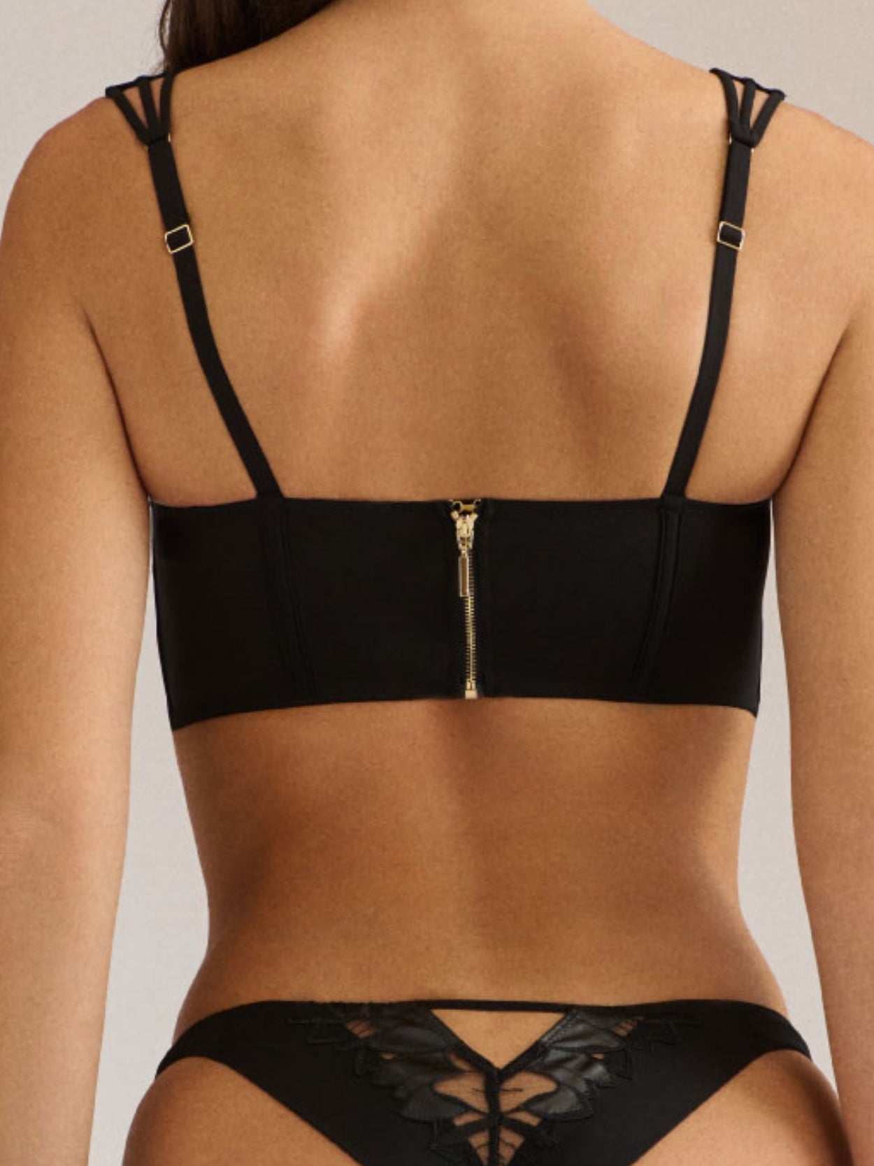 Underwired bustier bra with leather-look European embroidery, sheer details, and floral accents. Deep neckline enhanced by a separator, adjustable straps, and stretch microfiber back for optimal comfort.