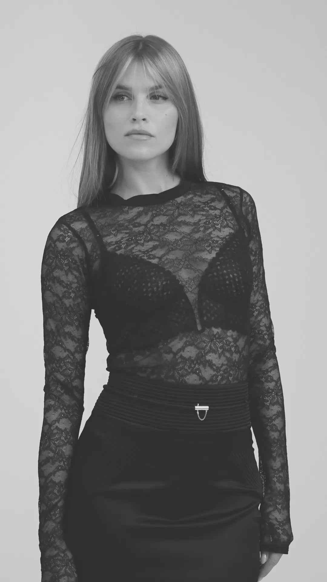 Long-sleeved top made entirely of lace. The transparency of the top and the floral pattern of the lace make it an ultra-feminine and sexy piece.