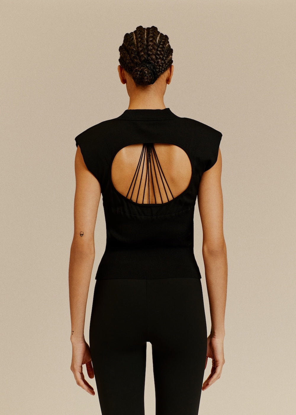 A triangle adorned with graphic embroidery alternating with delicate bands of tulle. The neckline, the interplay of sheer panels, and the intricately detailed back make it a subtly sexy, chic, and elegant piece.