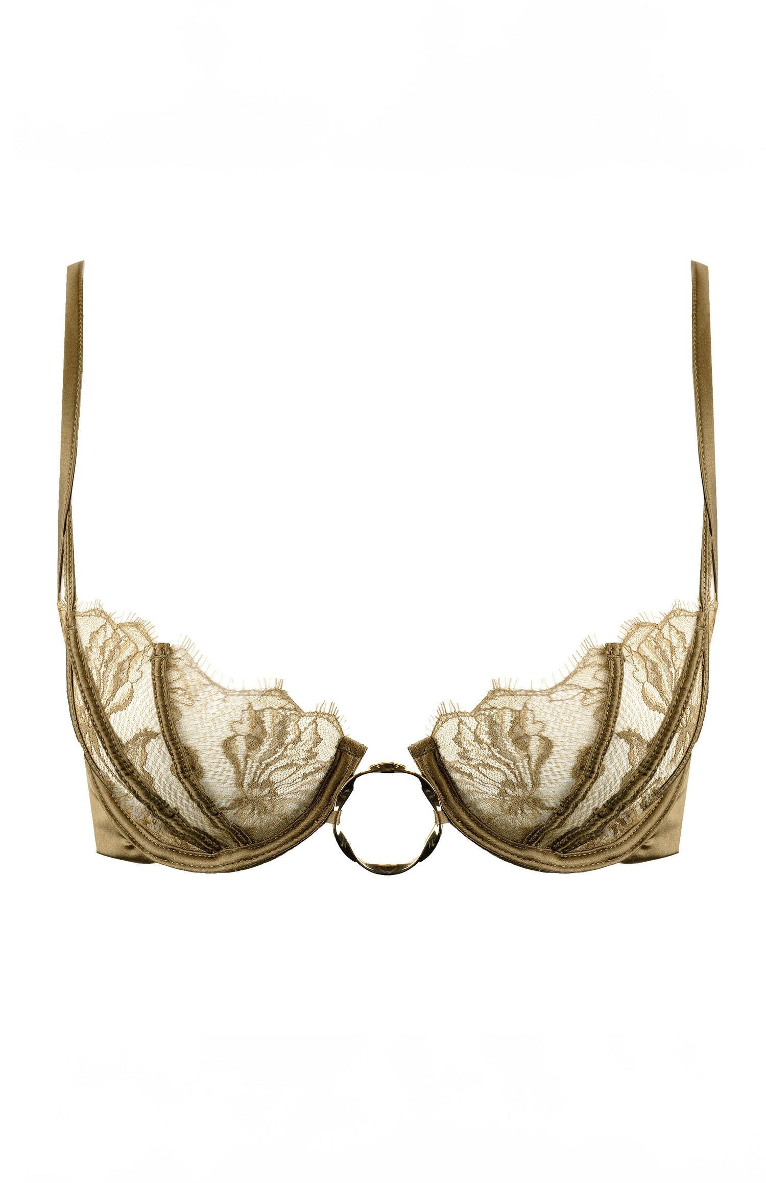 Balcony bras inspired by traditional corsetry, designed to shape and support the bust. Floral lace and silk satin are combined with a twisted gold ring, highlighting the décolleté with elegance and sensuality. Precision tailoring offers both support and lightness.