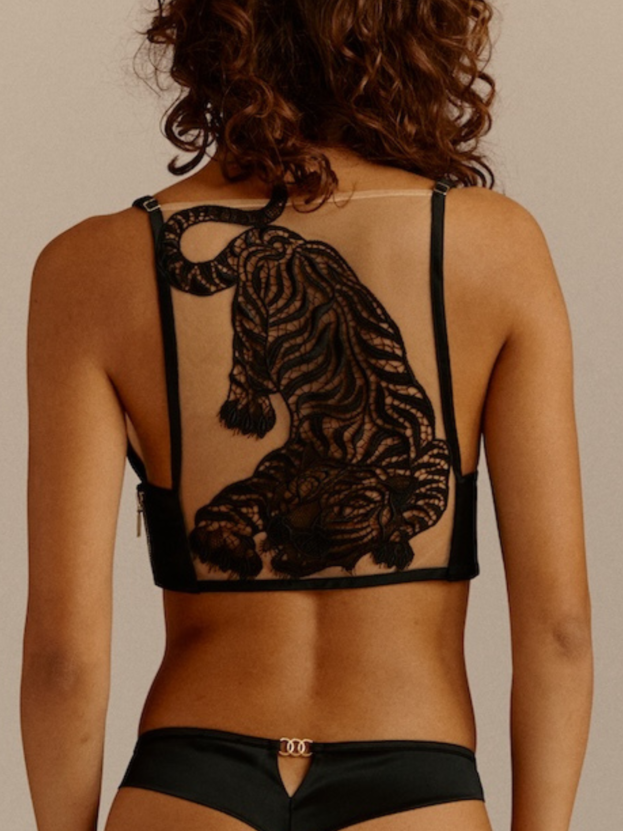 Triangle orné d’un tigre brodé façon tatouage, sublimant le dos pour un effet à la fois sensuel et puissant. Fine bretelle réglable, décolleté plongeant, ouverture par zip doré siglé LIVY sur le côté.
