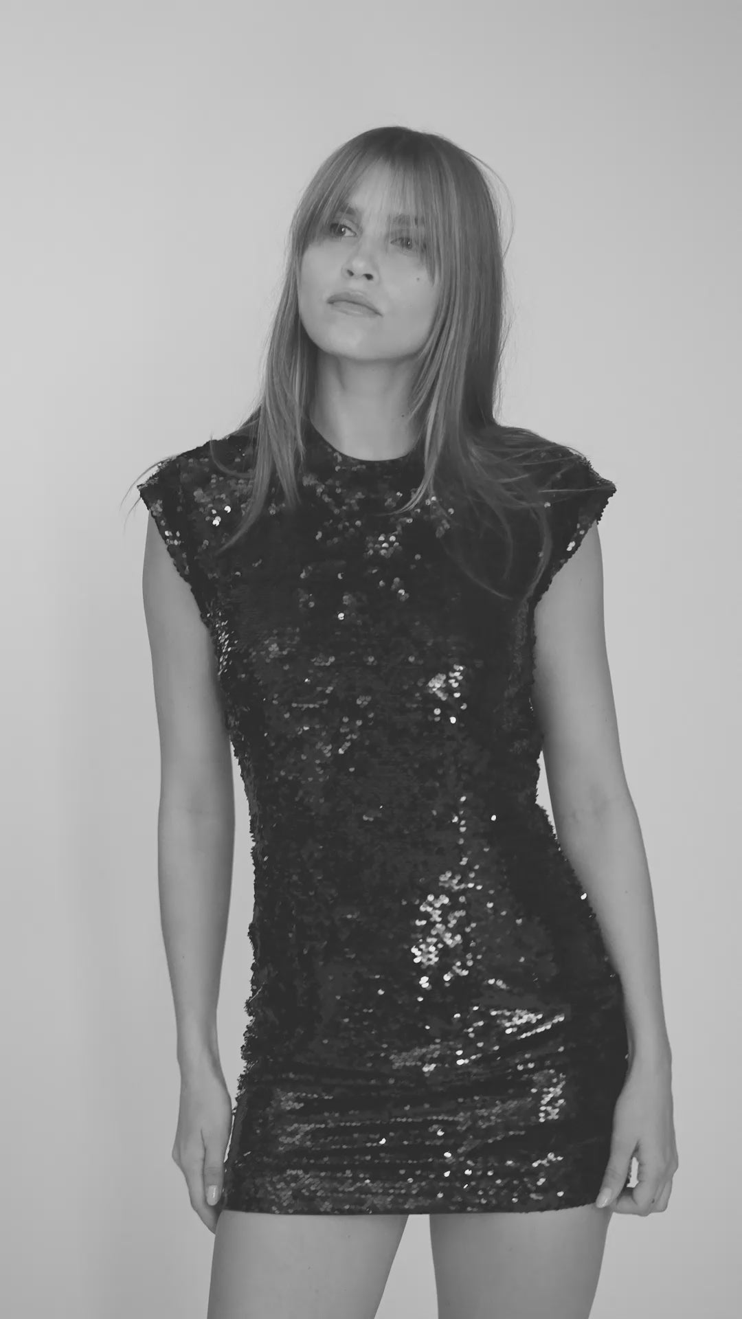 Robe noire à épaulettes au col montant et aux pinces structurantes. Son dos travaillé et sa coupe ajustée offrent une allure chic, moderne et féminine.