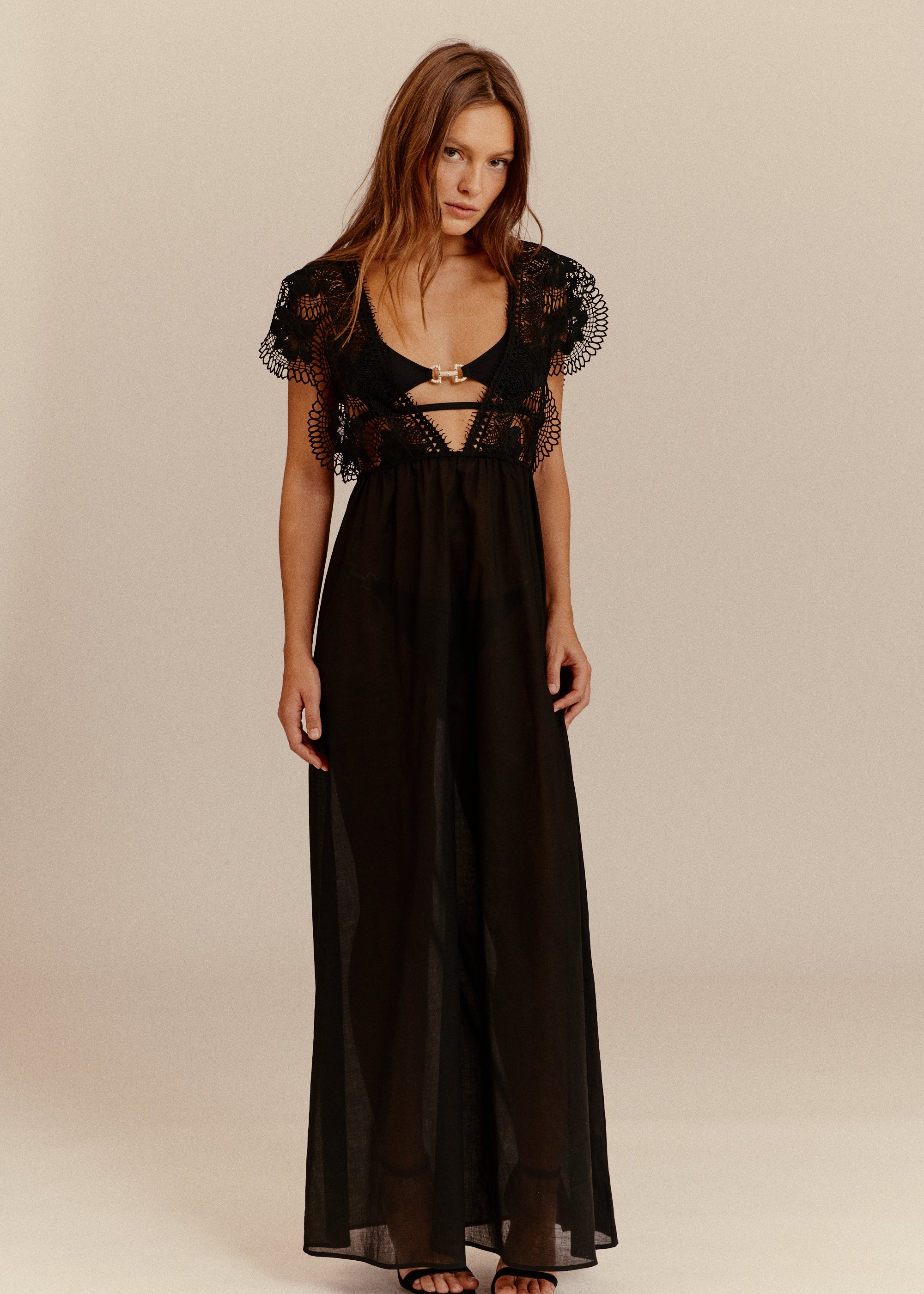 Robe longue en soie et guipure au décolleté plongeant et au dos dégagé. Le détail de la guipure florale, la transparence de la jupe et les ouvertures sur les côtés en font une pièce ultra-féminine et sensuelle.