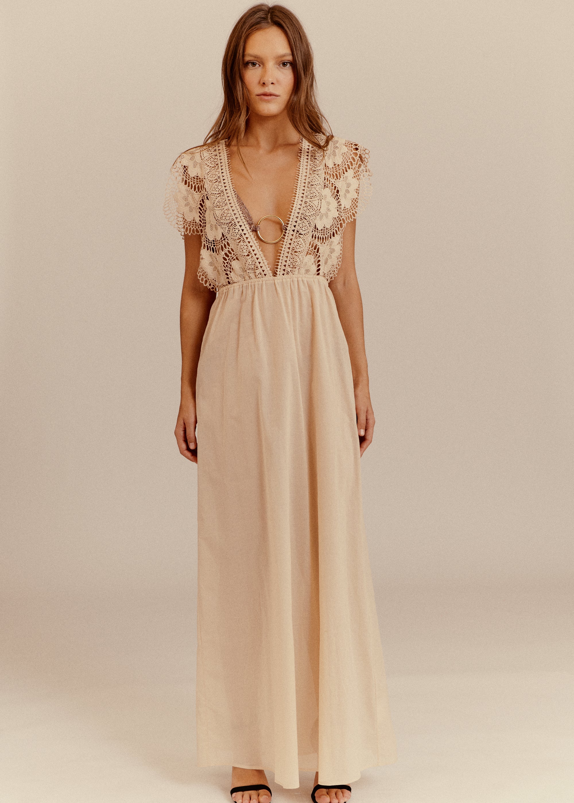Robe longue en soie et guipure au décolleté plongeant et au dos dégagé. Le détail de la guipure florale, la transparence de la jupe et les ouvertures sur les côtés en font une pièce ultra-féminine et sensuelle.