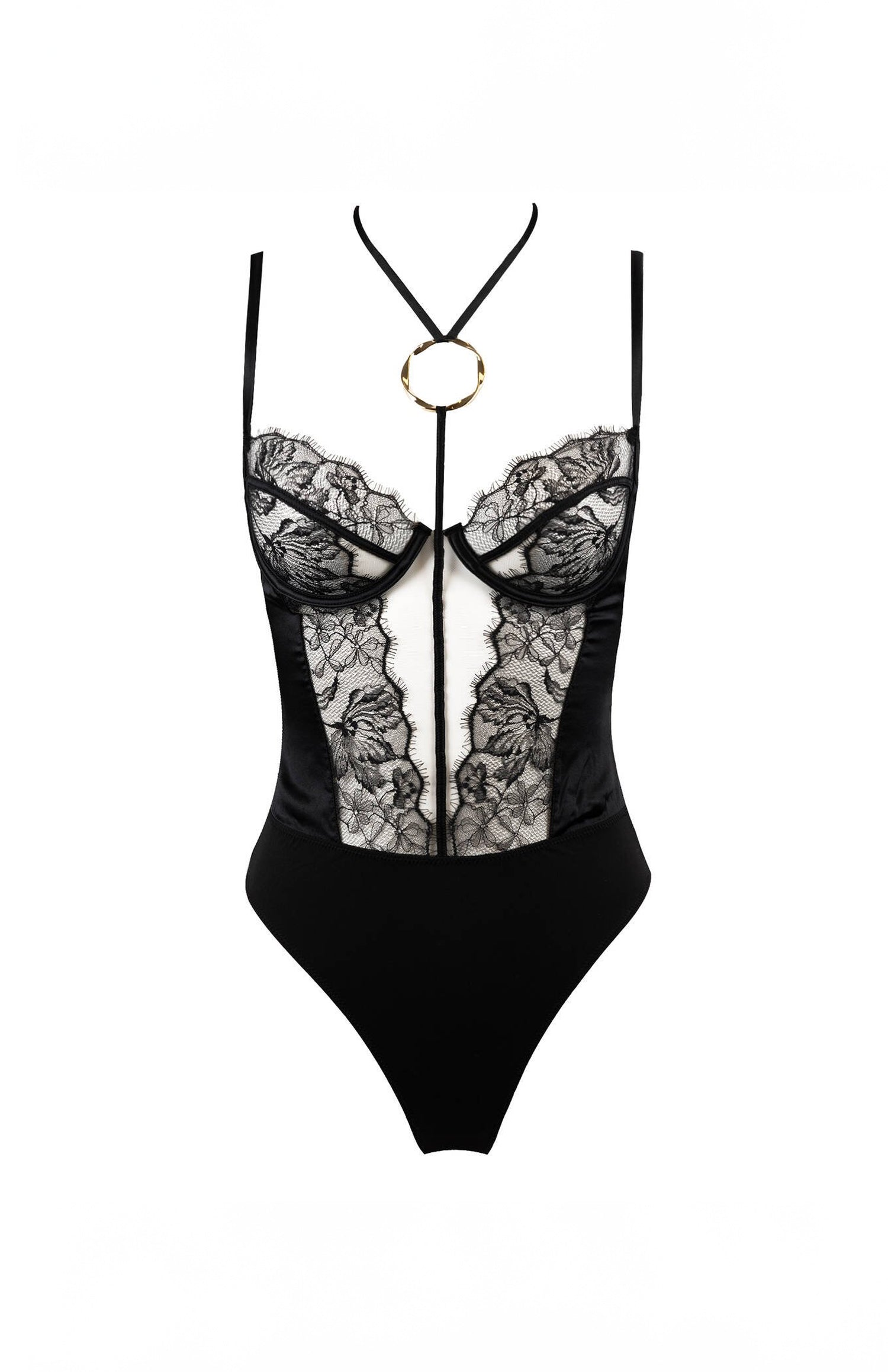 Body armaturé mêlant dentelle florale et satin de soie. Ses lignes croisées et ses transparences rehaussé d’un anneau doré torsadé , placé au creux du cou comme un bijou de peau. Silhouette sensuelle et contemporaine.