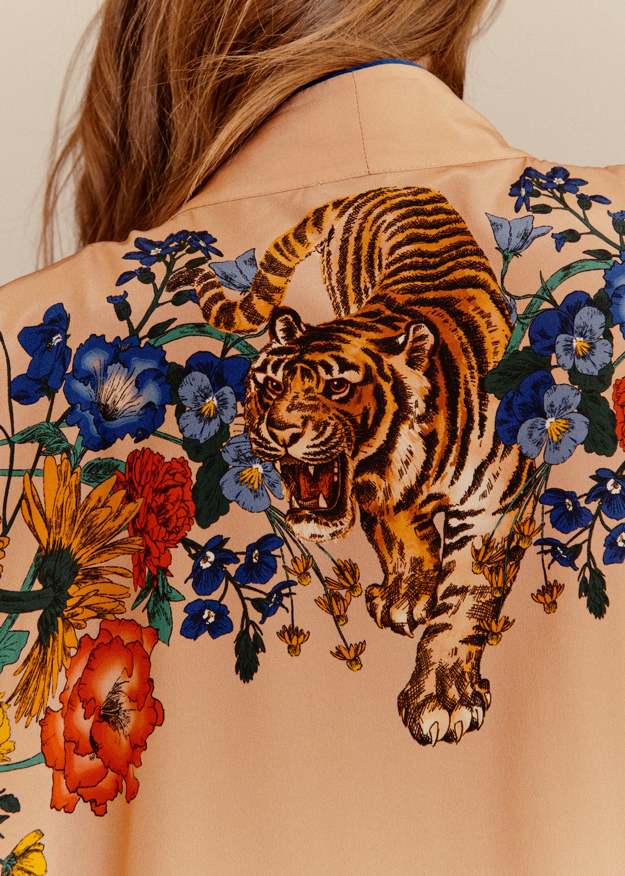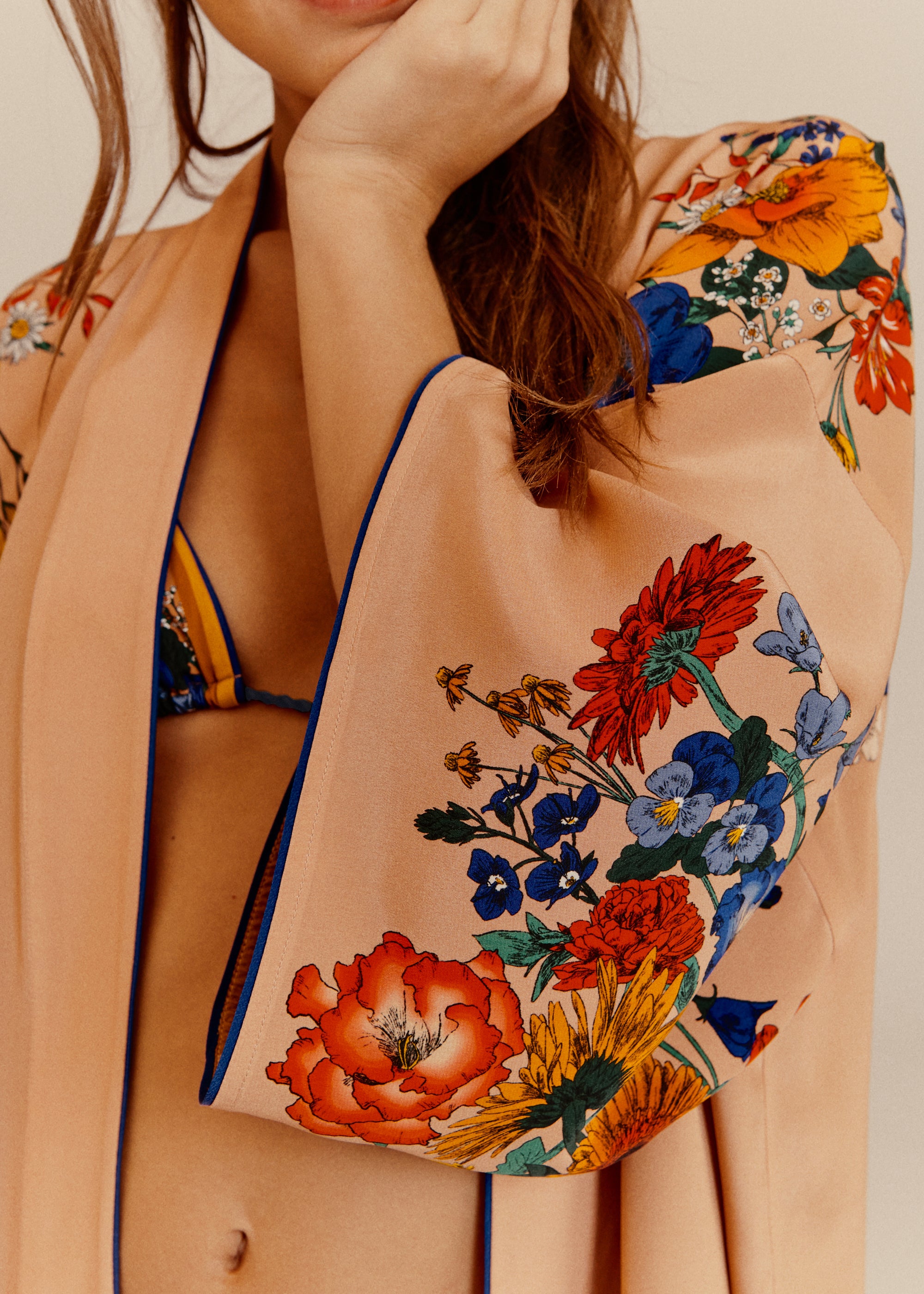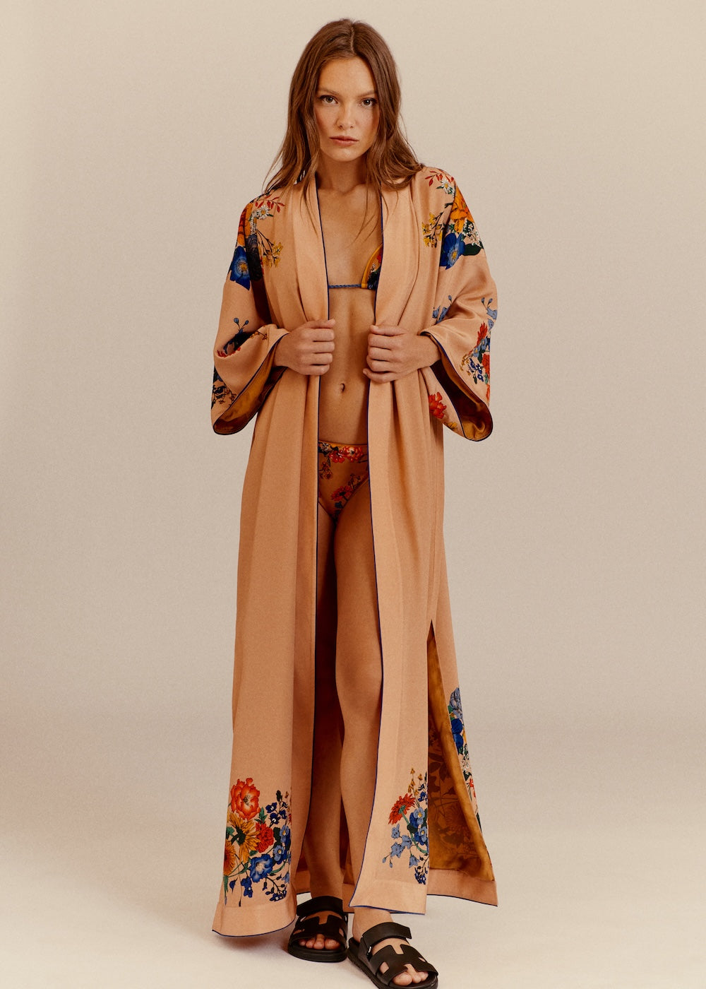 Kimono unique en soie. Avec sa coupe oversize et ses impressions signature LIVY, il offre une allure très féminine et intemporelle.