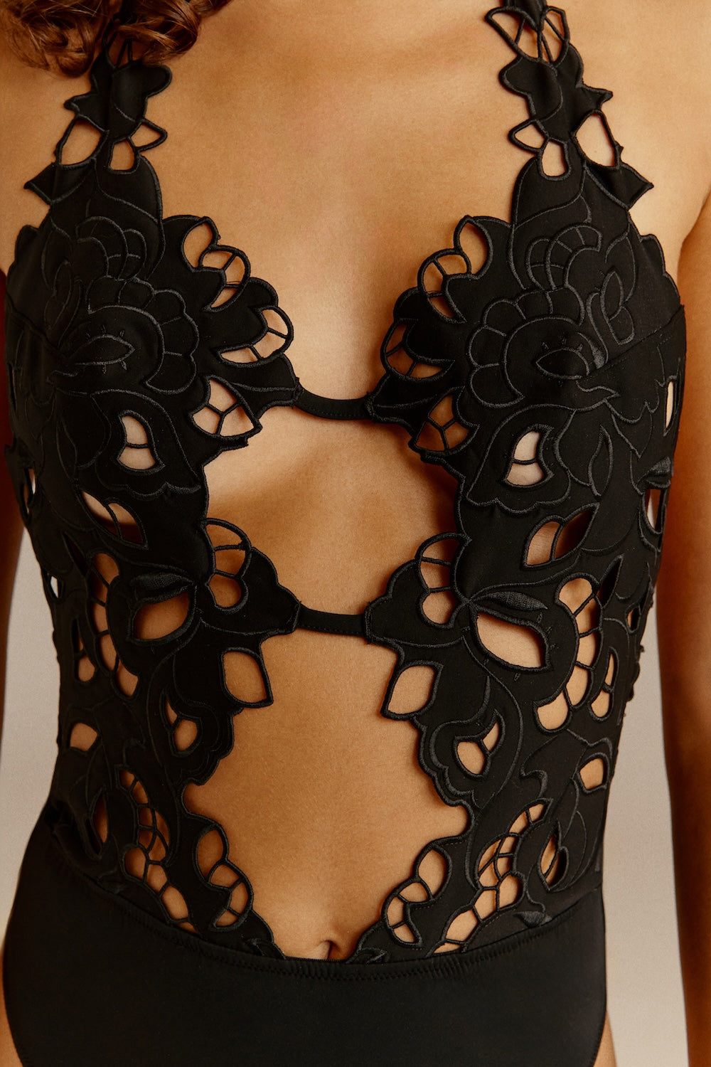Maillot une pièce en broderie anglaise aux motifs floraux, au décolleté vertigineux, pour un look à la fois très sexy et moderne, avec bretelles et tour de dos ajustables et embouts siglés Livy.
